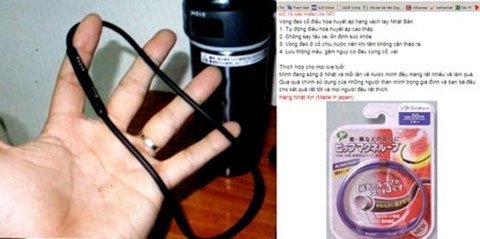 Thu hút bởi dòng quảng cáo “Vòng đeo cổ đặc trị bệnh thiếu máu”, PV liên lạc, gặp ông Bảo. Ông này cũng giới thiệu là hàng xách tay của Nhật, giá 700.000 đồng/vòng (loại 45 cm) và 750.000 đồng/vòng (loại 50 cm). Ngoài ổn định huyết áp, ông Bảo khẳng định vòng đeo cổ còn có khả năng trị bệnh thiếu máu. “Từ trường của nam châm “kích” hàm lượng sắt phát triển trong hồng cầu giúp tăng lượng máu. Do vậy, người nào thường hoa mắt nên đeo vòng này. Chưa hết, phụ nữ mang thai nên đeo vòng để tăng lượng máu trong cơ thể, giúp thai nhi phát triển.” - ông Bảo quả quyết.
