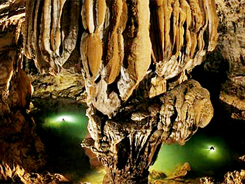 Đi sâu vào hơn 100m nữa có một lối rẽ thông với nhánh hang phía dưới, men theo chiếc cầu thang gỗ leo xuống là cả một không gian rộng lớn, ánh sáng từ những chiếc đèn pin trên mũ như vô vọng trước bóng đêm đen đặc, những rặng thạch nhũ đồ sộ, những viên bi đều tăm tắp được tạo thành bởi sự miệt mài của nước, tất cả như mê hoặc các thành viên trong đoàn.