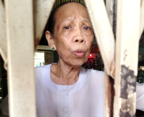 Bà Hoa đứng sau cánh cửa sắt, nói về đứa con trai sinh năm 1968 của mình. Bà mẹ 78 tuổi này cho biết không hiểu vì sao chuyện xảy ra cách đây 3 năm ròng, giờ lại có clip lan tràn trên mạng.