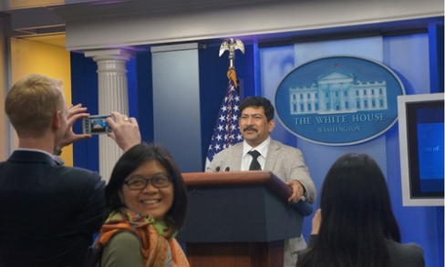 Cùng lúc này chúng tôi nhận được thông báo, Tổng thống Obama sẽ không xuất hiện trong Phòng họp báo số 1 mà chuyển tới một căn phòng khác bên trong Nhà Trắng, nơi Tổng thống làm việc.