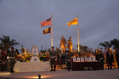 Trong khi đó, trong ánh đèn mờ mờ chiếu lên bầu trời hơi tối, ai cũng thấy hai là quốc kỳ VNCH và Hoa Kỳ bay phất phới trong gió, ngay phía sau hai bức tượng đồng hai người lính đồng minh.