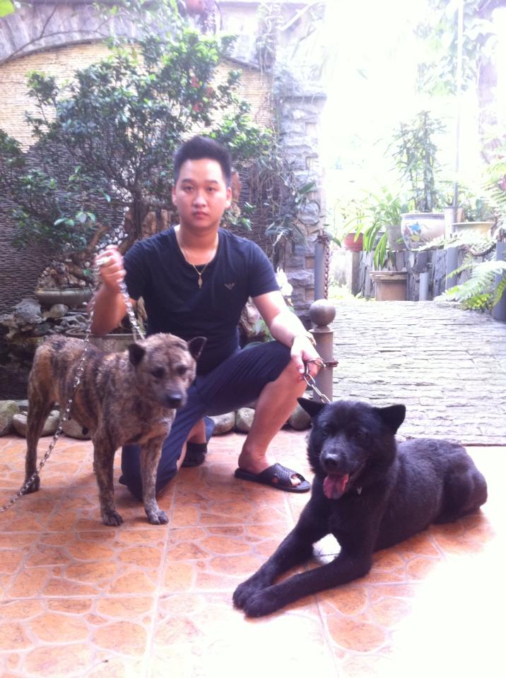 Hải Anh bên hai chú chó H'Mông cộc Tun và Báo
