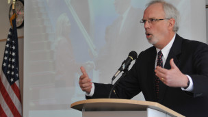 Đại sứ nói ông dùng tên gọi Biển Nam Trung Hoa vì đó là tên chính thức của chính phủ Hoa Kỳ, nhưng ông thông cảm với một số cử tọa trong cộng đồng muốn ông dùng tên Biển Đông hay biển Đông Nam Á. “Chuyện đặt một tên rất là khó, mà không phải chỉ ở Việt Nam,” ông nói. “Các đồng nghiệp Hàn Quốc luôn luôn muốn chúng tôi ngừng dùng tên gọi 'biển Nhật Bản' mà họ muốn chúng tôi dùng tên 'Biển Đông."