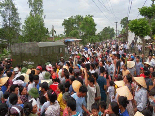 | Người dân thôn 3, xã Tân Thành vây kín, không cho lực lượng chức năng tiếp cận hiện trường. |