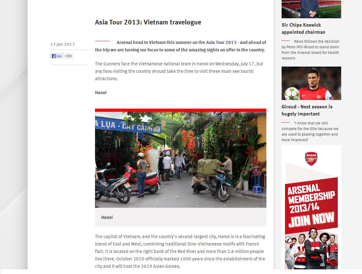 Việt Nam được giới thiệu đẹp lung linh trên trang chủ Arsenal