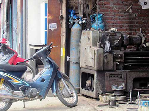 Tại phố Đê La Thành, các bình nén khí la liệt khắp các cửa hàng gia công kim loại