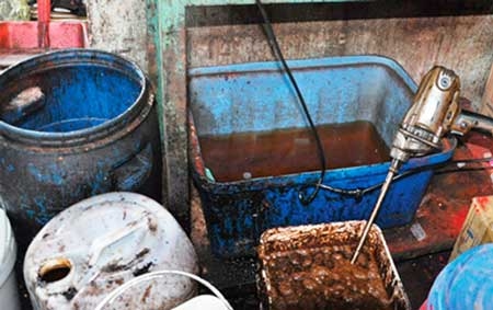 1 kg cà phê nhân rang, xay xong chỉ còn 0,7 kg, 1 kg cà phê bột nguyên chất chỉ có thể pha được 25 ly cà phê là đã rất cao tay rồi. Giá cà phê nhân khô trên thị trường giao động trong khoảng 45.000-50.000 đồng/kg, vậy giá thành tối thiểu cà phê bột phải là 100.000 đồng/kg. Giá 1 ly cà phê tối thiểu cũng phải 10.000 đồng/ly. Vậy mà trên khắp các vỉa hè TP Hồ Chí Minh và các tỉnh phía nam đang bán với giá 8.000 đồng/ly. Vậy đó là cà phê gì? Tôi đã đến một cơ sở chế biến cà phê ở phường Bình Trưng Tây (Q.2 TP.HCM). Trong một gian xưởng thấp tè, nóng hừng hực, bốn công nhân chân đất đang xả “cà phê” rang rồi xuống sàn xưởng, dùng xẻng đảo cho nguội trước khi xúc đổ vào họng máy xay. Mùi hóa chất hăng nồng bốc lên. Nhìn kỹ cái đống gọi là cà phê tôi thấy rõ chỉ khoảng 20% là hạt cà phê mà chủ yếu là hạt méo mó, hạt lép, còn chủ yếu là hạt ngô, hạt đậu nành. Những hạt này được rang cháy tẩm dầu mỡ và tinh dầu thơm mùi cà phê trông bóng loáng và thơm nức.