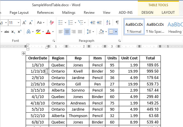 Thay đổi nhanh vị trí một hàng trong bảng Word 2013