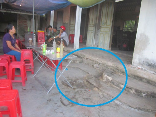 Hiện trường nơi xảy ra án mạng. Vết máu còn loang lổ khắp nền xi măng (vòng tròn xanh).