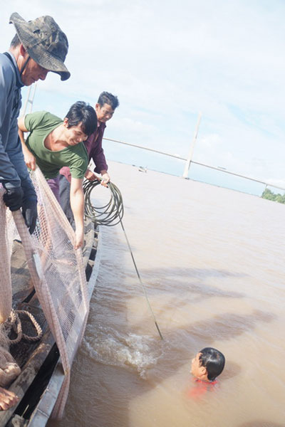 Vừa nói, chú cùng anh em thả chài. Những anh em đi theo ghe thì cầm dây hơi, một người ngậm dây lặn xuống. Theo anh Xuân, giựt một cái là nới dây “dung” xuống, hai cái thì kéo dây “dung” lên, ba cái là kéo chài lên.