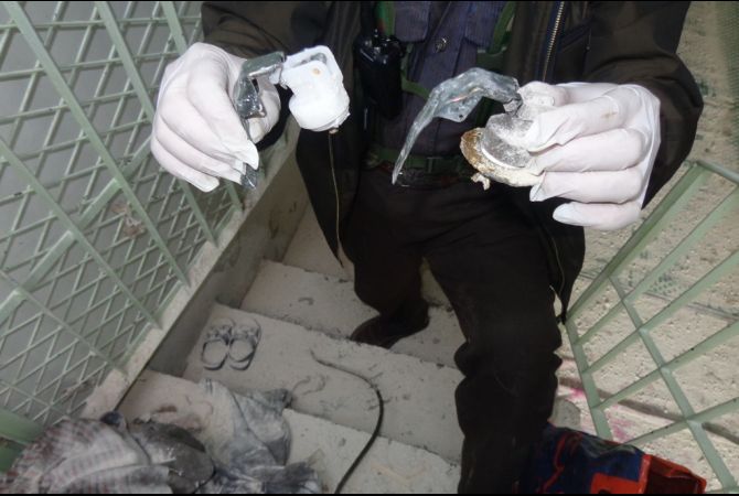 Cảnh sát cầm trên tay một hệ thống bị rơi từ máy bay trực thăng xuống nhà dân ở Aleppo, Syria, và nghi đó là một loại vũ khí hóa học, vào tháng 4/2013.