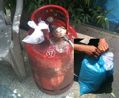 | Bình ga bị cắt dây và can xăng trong túi nilong |