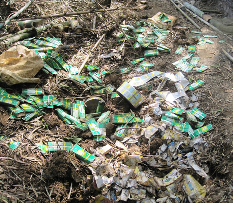 | Những gói thuốc BVTV cũng được t́m thấy dưới ḷng đất. |