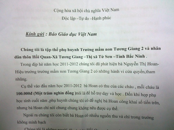 Sự việc trên đang xảy ra ở Trường Mầm non Tương Giang 2, xã Tương Giang, TX Từ Sơn, tỉnh Bắc Ninh. Cho tới sáng ngày 6/9, tức buổi học đầu tiên của năm học 2013-2014 vẫn có 190 phụ huynh đã cho con nghỉ học, hàng trăm phụ huynh cương quyết phản đối vì cho rằng hiệu trưởng nhà trường không minh bạch trong thu-chi tài chính, quản lí yếu kém...