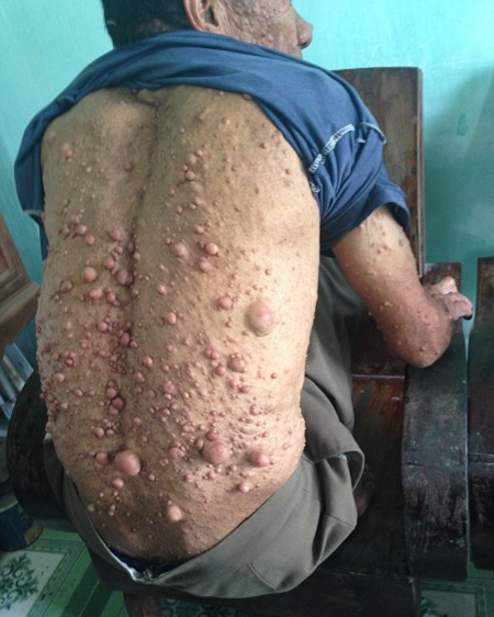 Đó là tình cảnh của ông Nguyễn Văn Đề, 59 tuổi, thôn Tiêu Sơn, xã Thanh Giang (huyện Thanh Miện, Hải Dương). 26 năm nay, cơ thể của ông dày đặc những mụn thịt như khối u. Ban đầu nó chỉ lấm tấm trên da thịt, dần dà thì to, mọng như chỉ chực vỡ ra.