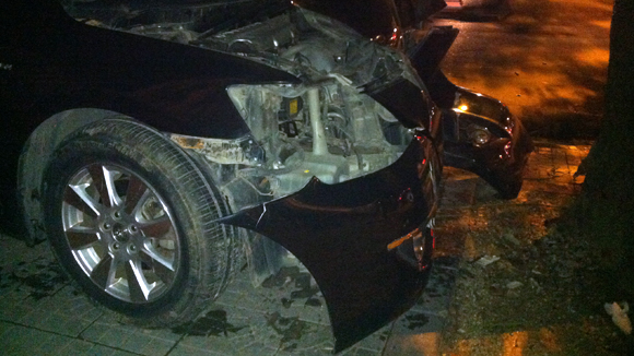 Camry trèo vỉa hè, xẻ đôi đầu do đâm vào gốc cây