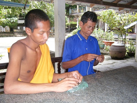 Sa Di Keo (bên trái) tu ở một ngôi chùa ở Pnong Penh sang Phnum Pi Lơ học đạo.