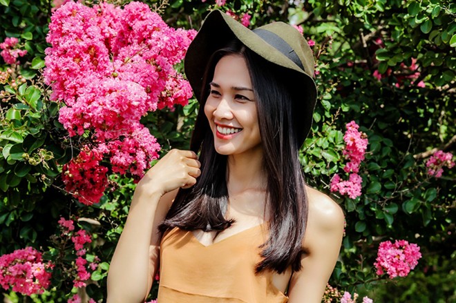 Hoa hậu phụ nữ Việt Nam qua ảnh 2006 Dương Mỹ Linh thư thái và nhẹ nhàng khi tản bộ giữa không gian đầy hoa vàng.
