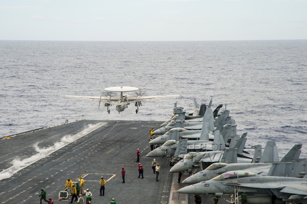 Máy bay trinh sát E-2C Hawkeye cất cánh từ tàu sân bay USS George Washington (CVN 73) trên biển Philippines ngày 26.10.2014. Nhóm tàu sân bay chiến đấu này đang luyện tập để sẵn sàng chiến đấu bảo vệ lợi ích hàng hải của Mỹ và các đồng minh cùng đối tác ở khu vực Ấn Độ Dương – Thái Bình Dương, theo trang web Hải quân Mỹ