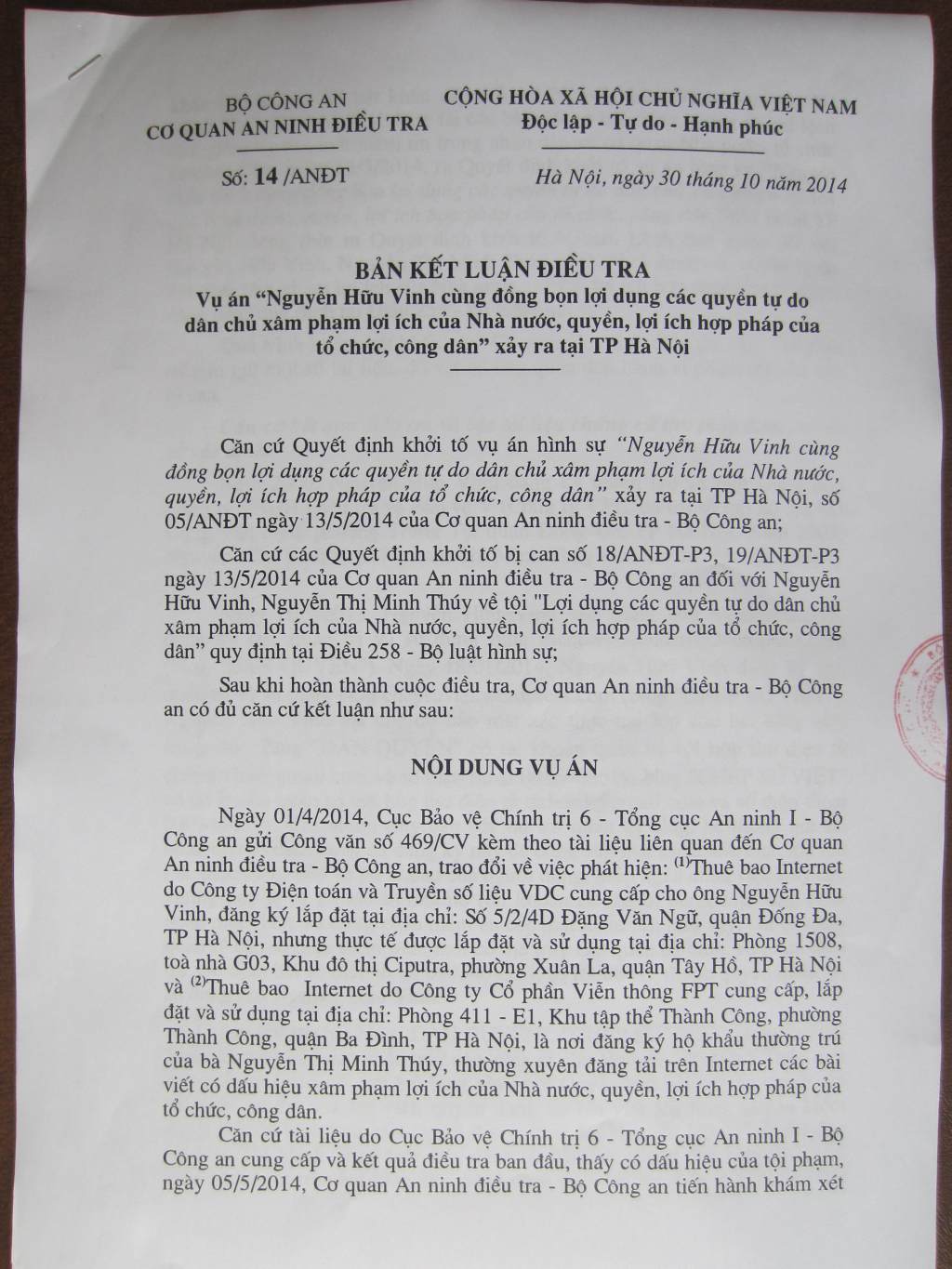 Chúng tôi vừa nhận được bản “Kết luận điều tra” về cái gọi là “Vụ án Nguyễn Hữu Vinh cùng đồng bọn lợi dụng các quyền tự do dân chủ, xâm phạm lợi ích của Nhà nước, quyền, lợi ích hợp pháp của tổ chức, công dân“, do Cơ quan An ninh Điều tra – Bộ Công an lập ra.