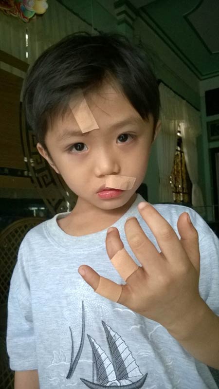 Cháu Quý bị thương trên mặt, tay do chai nước phát nổ.