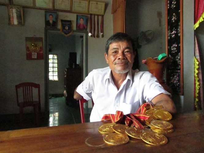 Khâm phục trước hàng chục bộ huy chương treo la liệt trong nhà của “kình ngư không tay”, tôi thực sự choáng khi nghe về thành tích mà ông liệt kê: Năm 2004 ông tham gia bơi giành được 3 huy chương Vàng tại hội thao người khuyết tật tỉnh và 4 huy chương Đồng tại hội thao người khuyết tật quốc gia. Năm 2005, tại hội thao người khuyết tật quốc gia ở Hà Nội, ông rinh được 2 huy chương Vàng và 3 huy chương Bạc. Năm 2006, tại TP. Hồ Chí Minh, ông phá kỷ lục quốc gia cự ly 200m bơi ếch. Năm 2008, ông đoạt 2 huy chương Bạc tại Đà Nẵng... Riêng ở giải cấp tỉnh thì ông dày đặc huy chương.