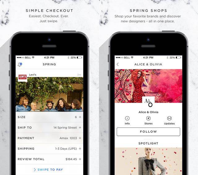 Spring - Bạn có thể lướt-để-mua những thương hiệu bạn thích như Levi's, Alice & Olivia và Opening Ceremony. Đơn giản, nhanh gọn. (Ứng dụng này miễn phí trên iOS)