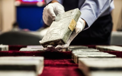 Một sĩ quan cảnh sát mở túi chứa ma tuý ở Quảng Đông, Trung Quốc. Photo Courtesy:CNS
