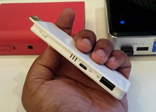 Là một phiên bản thế hệ tiếp theo do Intel thiết kế, chiếc máy tính này chỉ nhỏ gọn trong lòng bàn tay của người dùng. Sử dụng chip Intel Bay Trail-T SoC Intel Atom Z3000 làm trung tâm của sức mạnh, nó chắc chắn không thể so sánh với những bộ PC mạnh mẽ mà chúng ta vẫn đang sử dụng hiện tại. Thế nhưng công nghệ vẫn đang phát triển, và với sức mạnh hiện tại cũng đã đủ để chiếc máy tính này thực hiện các tác vụ cơ bản trên Windows. Do không có màn hình riêng nên nó sẽ cần kết nối với một màn hình thông qua HDMI và sử dụng cổng USB để cung cấp năng lượng. Tuy nhiên chuẩn USB 2.0 đang còn rất phổ biến hiện nay là không đủ để cung cấp năng lượng cho nó, và bạn sẽ cần dùng một bộ sạc nguồn riêng dành cho chiếc máy tính này. Intel dự kiến khi chuẩn USB Type-C ra đời thì chiếc máy tính của họ có thể sạc trực tiếp qua cổng USB mà không cần bộ nguồn trung gian.