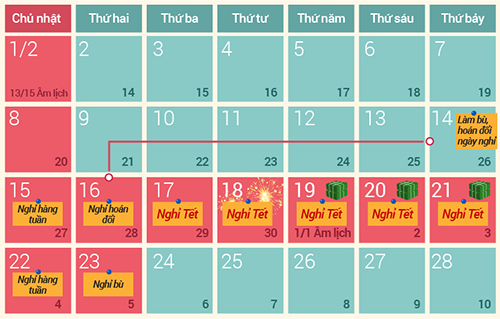 Cụ thể, công chức, viên chức sẽ nghỉ từ ngày 15/2 đến hết ngày 23/2 (tức là từ 27 Tết đến hết mùng 5 Tết). Tổng số ngày nghỉ của dịp này là 9, gồm 4 ngày cuối năm Giáp Ngọ và 5 ngày đầu năm Ất Mùi. Người lao động sẽ đi làm bù vào thứ bảy (14/2) để nghỉ thứ hai (16/2).