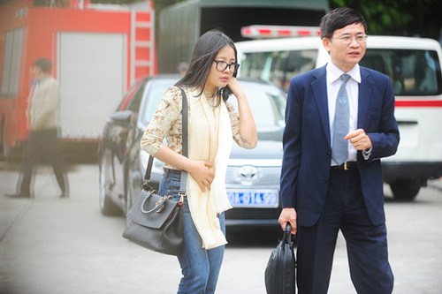 Hình ảnh vợ bầu Kiên trong sân tòa hôm 1/12.