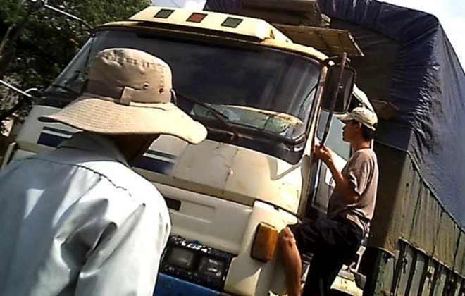 Tài xế xe tải không đồng ý và tiếp tục cho xe chạy nhưng Đạt vẫn đập cửa, “đeo” theo khoảng 50m, cuối cùng tài xế phải rút tờ 5.000 đồng đưa cho Đạt. Xong “phi vụ” này, Đạt ngồi ung dung đọc báo, khoảng năm phút sau tiếp tục “đeo” theo đập cửa xe tải khác.