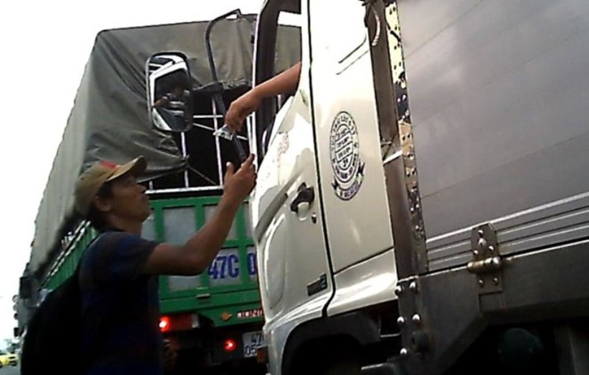 Trong khoảng thời gian từ 11g30-12g ngày 4/12, chúng tôi ghi hình được gần 10 lần Đạt “đeo” các xe tải xin đểu như vậy và rất ít tài xế dám từ chối. Trước đó trưa 3/12, Đạt cũng đập cửa xe, xin tiền khoảng 15 tài xế.