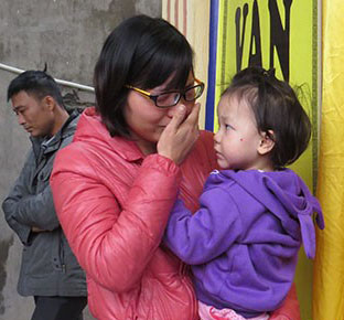 Chị Bùi Thị Huyền (vợ anh Đạt, SN 1983) chỉ biết ôm đứa con 2 tuổi vào lòng khóc nức nở mà không thể nói lên lời bởi sự ra đi đột ngột của chồng.