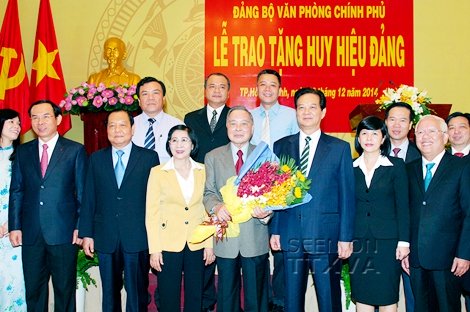 Thay mặt Lãnh đạo Đảng, Nhà nước, Thủ tướng Nguyễn Tấn Dũng đã trân trọng trao tặng Huy hiệu 55 năm tuổi Đảng cho nguyên Thủ tướng Phan Văn Khải.