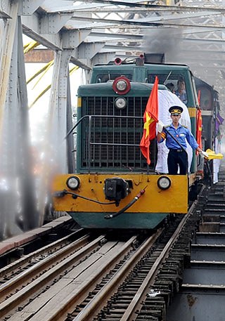 Mặc dù đã xuống cấp nhưng hàng ngày vẫn rất nhiều đoàn tàu qua lại cầu Long Biên. Ảnh: Internet