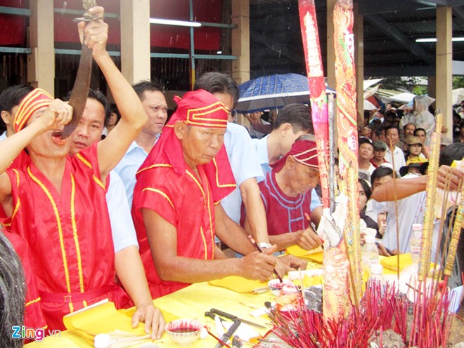 Theo ông Quang, trước khi cắt lưỡi, 4 "xác ông Bổn" được đoàn tùy tùng thay trang phục chỉnh tề. Họ đứng trước bàn hương án khói nhang nghi ngút, trên bàn gồm nhiều dao và đao nhọn cùng hàng chục nghìn tờ giấy có một mặt màu vàng để vẽ bùa.