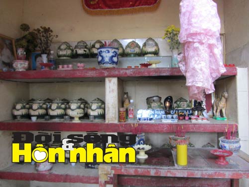 Thấy chúng tôi cứ loay hoay, ông Tư hướng dẫn cách thắp nhang theo thứ tự cắm vào bát hương miếu “Mẹ” trước, tiếp đến là hai miếu thờ Quan Âm ngay trước cửa, kế đến là miếu thờ Quan Vũ và cuối cùng là ngôi miếu thờ di ảnh của cô Lan và anh Hành, cùng 34 bộ hài cốt khác. Ông lão lái đò khấn:“Con lạy Bồ Tát, con xin phép ơn trên, nay con tới thắp hương trước tiên là xin sức khỏe cho gia đình con. Kế đến con khẩn khoản ơn trên cho con cái số để con rộng đường làm ăn, cho qua cơn tai ương này. Mong bà cho phép. Nếu đặng con sẽ quay lại làm lễ hậu tạ thật lớn…”. Cứ thế, ông lão lái đò khấn những câu dài dằng dặc một cách trơn tru như được học thuộc lòng tự bao giờ.