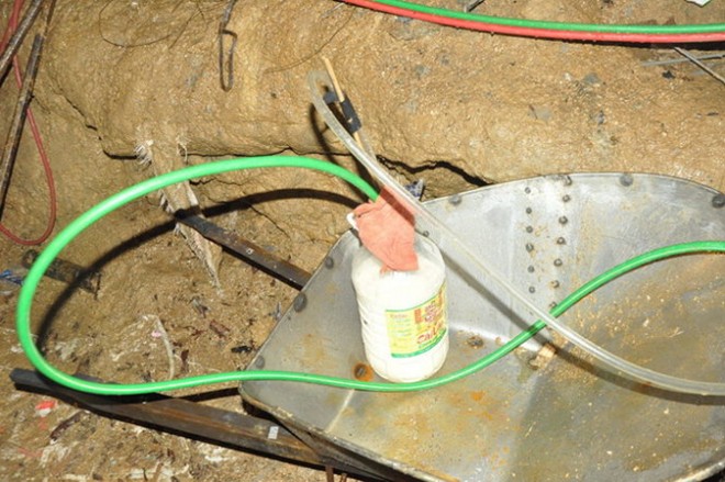 Những người bên ngoài sẽ bơm sữa, nước và cháo qua đường ống vào cho các nạn nhân 4 giờ/lần. Sữa được đổ vào bình 5 lít, đút ống nhựa vào rồi bơm bên trong đường ống dài hơn 30 mét. Ảnh: Tuổi trẻ
