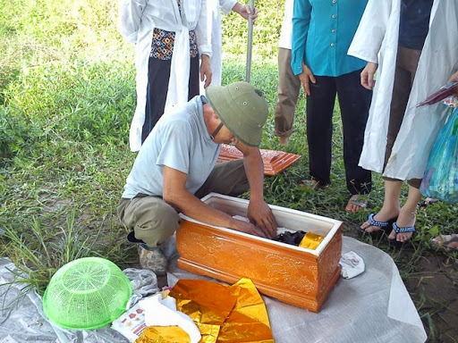 Có mặt trong đám đông, tôi cũng cố chen bằng được để tận mắt chứng kiến “di sản” của một kiếp người sót lại sau 4 năm về với đất mẹ. Nhìn vào trong quan tài, tôi chỉ thấy lùng bùng một mầu đen đặc quánh nước, quần áo, vài cái xương người nằm ngổn ngang. Người nhà nhìn thấy cảnh này cũng xót lắm, nhưng biết làm sao, quy luật tự nhiên là vậy.
