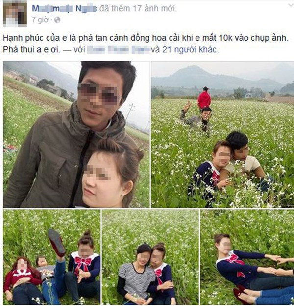 Mới đây nhất, 22/12, một cô gái với tài khoản M.M.N đã đăng tải công khai một loạt ảnh lên Facebook cá nhân kèm theo status: “Hạnh phúc của em là phá tan cánh đồng hoa cải khi em mất 10k (10.000 đồng) vào chụp ảnh. Phá thui (thôi) a e ơi (anh em ơi)”.