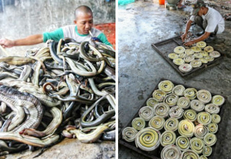 Rắn trước khi làm thịt sẽ bị đập một cái thật mạnh vào phía sau khiến nó choáng váng. Sau đó, người ta sẽ chọc một chiếc vòi vào miệng rồi bơm nước cho nó phồng lên như một quả bóng. Tiếp đến, họ lấy một chiếc móc rạch một đường quanh đầu rắn rồi lột da.