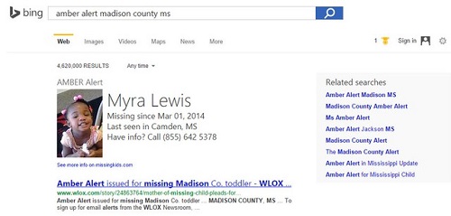 Được biết, Microsoft hiện đang làm việc với National Center for Missing and Exploited Children (trung tâm quốc gia về trẻ em mất tích và bị bóc lột) nhằm giúp phát sóng AMBER. Nếu có người tìm kiếm một thông báo AMBER, Bing sẽ dựa trên địa điểm của họ và đưa ra những kết quả khả dụng về những đứa trẻ mất tích.