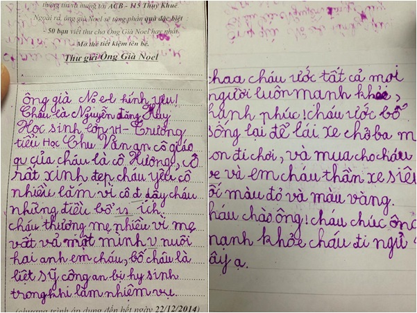 Theo chị Minh Thúy - người đăng tải chia sẻ thì bức thư này được Huy viết trong cuộc thi "Đi tìm ông già Noel" do cơ quan chị tổ chức ở trường Huy.