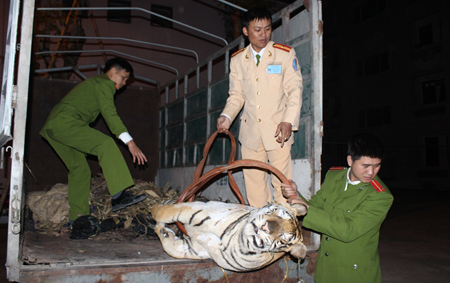 Kiểm tra thùng xe, cảnh sát phát hiện trên xe có giấu 1 con hổ nặng 120 kg, dài 1,5 m đã chết và được ướp lạnh.