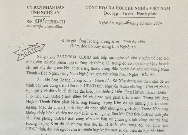 Do thiếu tôn trọng đối với Chủ tịch UBND tỉnh Nghệ An trong một cuộc họp, Giám đốc Sở Xây dựng Nghệ An đă phải viết kiểm điểm.Sáng ngày 2/1, ông Hoàng Trọng Kim đă gửi bản kiểm điểm tới Chủ tịch UBND tỉnh Nghệ An và Ban cán sự đảng UBND tỉnh.