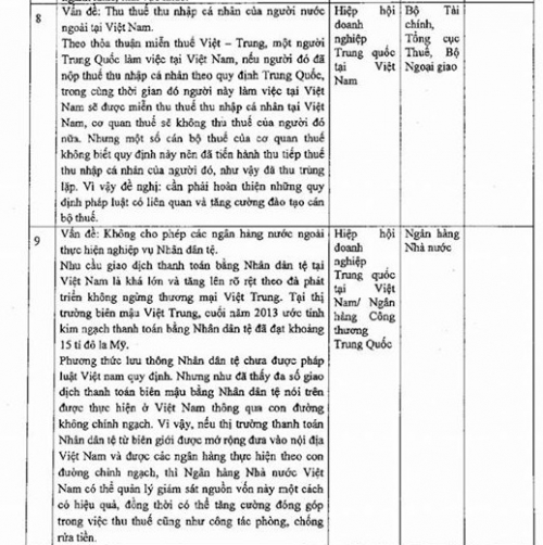 Đây là các “yêu sách” của phía các doanh nghiệp Trung Cộng, và chi nhánh Ngân hàng Trung Cộng tại Việt Nam. Nếu thực hiện theo những điều họ kiến nghị, thì các doanh nghiệp, chi nhánh ngân hàng và cá nhân Trung Cộng tại Việt Nam hoạt động không khác gì trên đất Trung Cộng. Phía Trung Cộng vốn đã nhận được nhiều ưu đãi, nay lại “được đằng chân lân đằng đầu”, đòi hỏi thêm những điều phi lý.