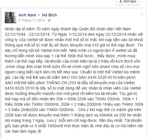 Những nội dung được tung ra chủ yếu như: “Nhân dịp kỉ niêm 70 năm ngày thành lập Quân đội nhân dân Việt Nam 22/12/1944 - 22/12/2014. Từ ngày 1/12/2014 đến ngày 22/12/2014 nhân viên công ty của Viettel sẽ được nhận một mã số bí mật, khi nạp tiền vào tài khoản thông qua mã số bí mật ấy sẽ được khuyến mại x10 giá trị thẻ nạp được. Tin này chỉ trong nội bộ Viettel mới biết. Nhà mình có người làm ở viettel và đã hướng dẫn mình vừa nạp 1 cái thẻ 100k thử trước thấy được mình mua thêm cái thẻ nạp tiếp, tài khoản của mình hiện tại là 2 triệu rồi”. Các bước hướng dẫn nạp tiền cũng được ghi đầy đủ. Thậm chí còn có lưu ý cho cả người nạp “mỗi sim chỉ nạp được 1lần duy nhất. Tài khoản gốc bạn phải có ít nhất 1000vnđ mới thực hiện đc nhé! Đây là cơ hội hiếm nên các bạn làm ngay đi”.