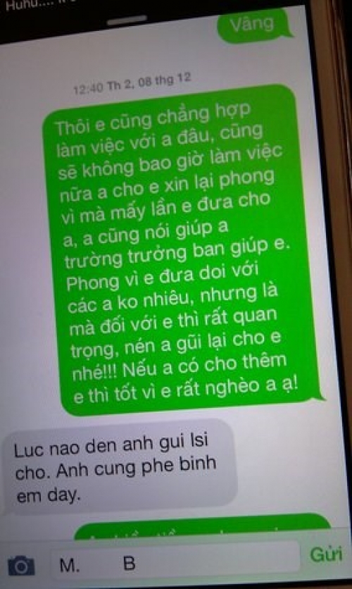 Số máy từ nữ doanh nhân: “Thôi e cũng chẳng hợp làm việc với a đâu, cũng sẽ không bao giờ làm việc nữa a cho e xin lại phong vì mà mấy lần e đưa cho a, a cũng nói giúp a trường trưởng ban giúp e. Phong vì e đưa doi với các a ko nhieu, nhưng là mà đối với e thì rất quan trọng, nén a gũi lại cho e nhé!!! Nếu a có cho thêm e thì tốt vì e rất nghèo a ạ!”
