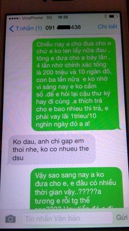 Số máy từ nữ doanh nhân: “Chiều nay a cho dua cho e chứ e ko len lấy nữa đau, tông e đưa cho a bảy lần, 4 lần nhớ chính xác tổng là 200 triệu và 10 ngàn đô, còn ba lần nữa e ko nhớ vì sáng nay e ko cầm sổ, để e hỏi lại cậu thư ký hay đi cùng .a thích trả cho e bao nhieu thì trả, e phải vay lãi 1 trieu/10 nghìn ngày đó a a!”